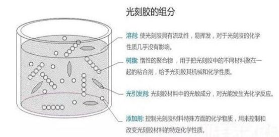 光刻膠包括溶劑、樹脂、光引發劑、添加劑等四部分。