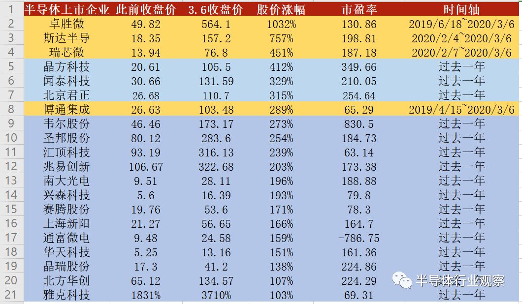 過去一年TOP 20半導體漲幅股一覽(注:部分半導體企業(yè)按照上市時間為起點算,統(tǒng)計截止時間為2020/3/6)