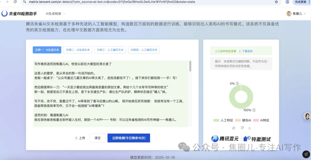 當然,你很難讀出來Ai味道,因為即使是朱雀,最后的檢測結果都在說“人工特征顯著”: