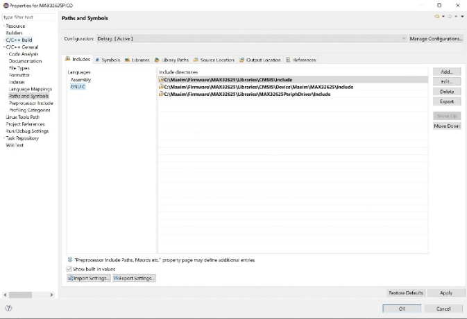 從MAX32625的核心(Arm內(nèi)核)開始向外展開,有一組文件用于配置Arm內(nèi)核本身,然后有一組文件用于配置Arm內(nèi)核周圍的外設(shè),最后有一組文件用于配置評估套件上微控制器周圍的器件。為了Eclipse能夠在編譯程序時找到這些文件,需要對Eclipse進行配置。