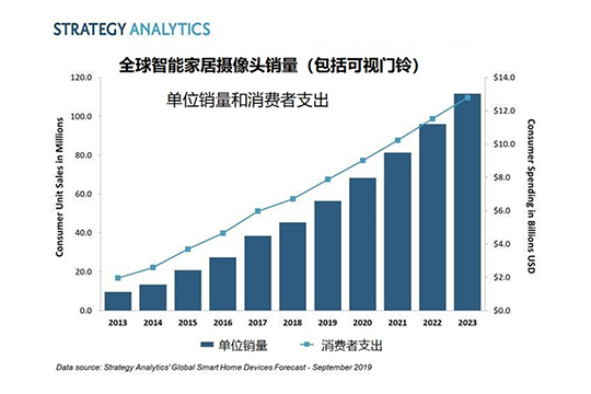 Strategy Analytics最新研究報告《 2019年智能家居監(jiān)控攝像頭市場預(yù)測和分析》指出,2019年全球消費者將在智能家居攝像頭(包括可視門鈴)上支出近80億美元,并以14%的復(fù)合年增長率增長至2023年近130億美元。