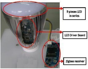 此方案由兩塊電路板組成,一款是LED驅(qū)動板,集成在LED燈泡里面。另一塊是MCU+Zigbee電路板用來接收無線信號并給LED驅(qū)動板提供控制信號。
