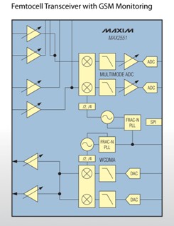Maxim Integrated Products推出支持WCDMA (波段1至6、8至10)和cdma2000 (波段0、1和10)的femtocell收發器MAX2550–MAX2553。