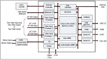 MAX64180可理想用于基本檔次、主流檔次和高畫質HD H.264編解碼器、MJPEG編解碼器、HD MPEG2解碼器、視頻前置處理器和后置處理器、240MHz ARM9? CPU以及USB 2.0 OTG等所需外設。音/視頻子系統的核心電路包括兩個實時可編程多媒體引擎(MME),一個用于控制視頻編解碼器和輸入/輸出處理器;另一個用于實現軟件音頻編解碼器和初級分析,從而使ARM9處理器專注于處理應用程序。
