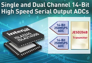 Intersil 公司推出業(yè)內(nèi)速度最快、功耗最低和支持JESD204B串行輸出的單通道及雙通道14位模數(shù)轉(zhuǎn)換器(ADC)--- ISLA224S/ISLA214S50,這些串行輸出ADC的單通道和雙通道采樣率分別可達(dá)500兆/秒(Msps)和250兆/秒。兼容JESD204B標(biāo)準(zhǔn)的集成發(fā)送器的數(shù)據(jù)傳輸率高達(dá)4.375Gbps/鏈路,只需要兩條鏈路來支持雙通道14位250Msps轉(zhuǎn)換器(每通道一個鏈路通道)或單通道14位500Msps轉(zhuǎn)換器。發(fā)送器中還包括可選的第三條鏈路通道,在小于3.125Gbps的傳輸率下操作串行鏈路時,可支持最大采樣率,提供了對JESD204A標(biāo)準(zhǔn)的向后兼容性,以支持更低成本的FPGA。