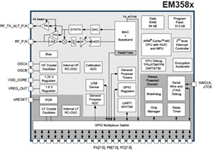 EM358x SoC系列產(chǎn)品為物聯(lián)網(wǎng)中特性豐富的下一代ZigBee?應(yīng)用提供了理想的網(wǎng)狀網(wǎng)絡(luò)平臺。EM358x系列產(chǎn)品包含6款SoC產(chǎn)品,其片內(nèi)包括2.4GHz IEEE 802.15.4射頻收發(fā)器、ARM Cortex?-M3處理器、256kB或512kB Flash、32kB或64kB RAM,擁有強(qiáng)大的硬件支持網(wǎng)絡(luò)級調(diào)試特性。額外的存儲器能夠最小化對于獨(dú)立系統(tǒng)處理器的需求,使得開發(fā)人員可以使用單顆ZigBeeSoC替換多處理器設(shè)計中的部分或所有設(shè)計,從而減少BOM成本和最終產(chǎn)品尺寸。