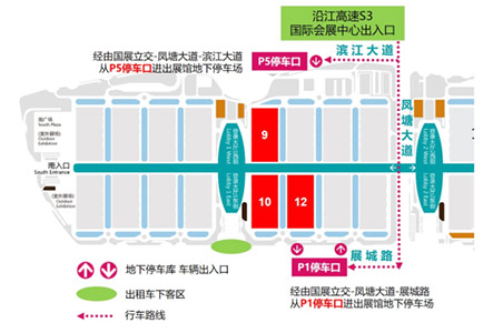 沿江高速S3(國(guó)際會(huì)展中心出口),經(jīng)由國(guó)展立交-鳳塘大道-濱江大道從P5停車口進(jìn)出展館地下停車場(chǎng);