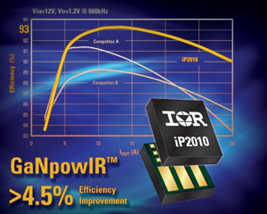 因為iP2010能夠工作在比傳統硅解決方案更高的頻率范圍內,因而在空間非常寶貴的場合它能提供最大的功率密度。通過將功率級電路工作在這些更高的開關頻率,還能減小輸出電容和電感的值和體積,進而減小整個電路板面積。