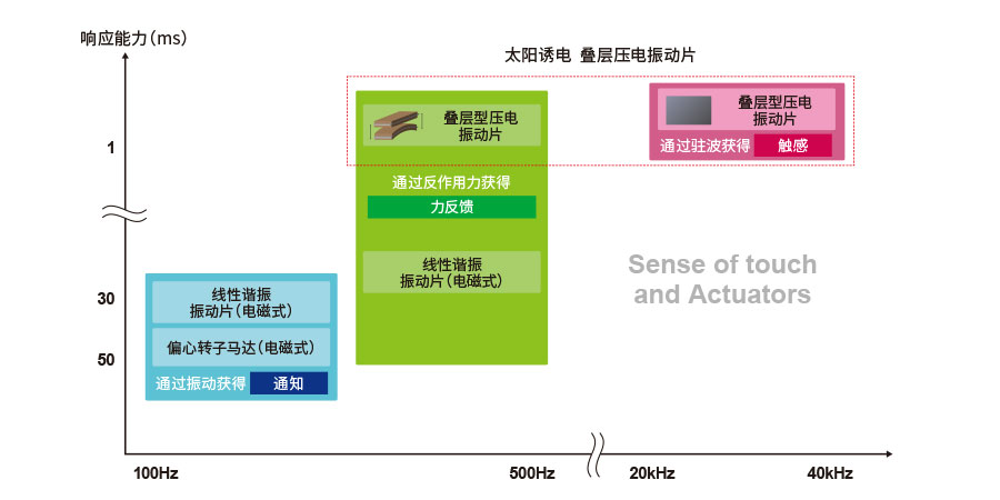 觸覺感應功能運用了多種多樣的振動片。"通知"運用了偏心轉子馬達、線性諧振振動片等電磁式振動片,"力反饋"則在上述電磁式振動片的基礎上另外使用了疊層壓電振動片。進一步發展至"觸感"方面后, 驅動頻帶寬、響應速度快的疊層壓電振動片則將變得不可或缺。
