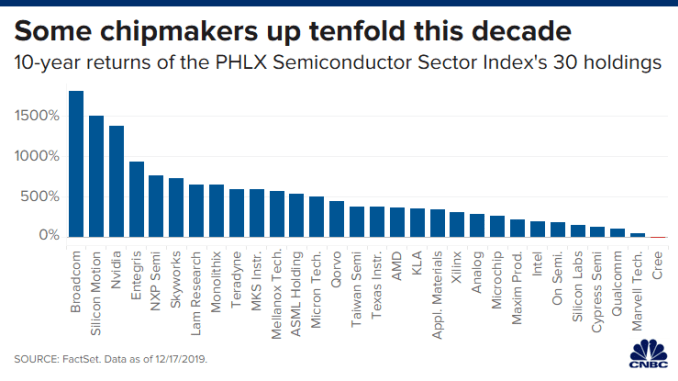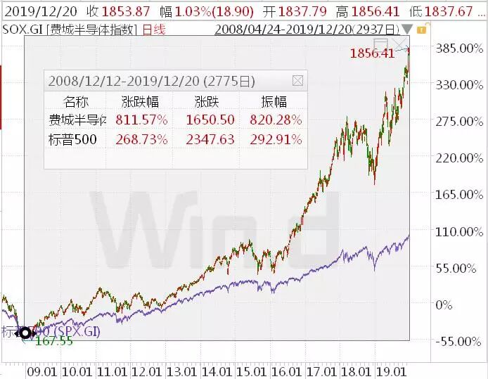 Wind 數據顯示,費城半導體指數近10年漲幅遠遠超過了同期的標普50指數。其成分股中,博通在2009年上市,當時股價不足15美元,近一月最高股價為331.20美元,漲幅超過20倍。美光科技2008年低點為1.59美元,上周五收盤價為55.06美元,漲超30倍。跟蹤美國25大芯片股的VanEck Vectors Semiconductor ETF 近十年的收益率也到到了400%!