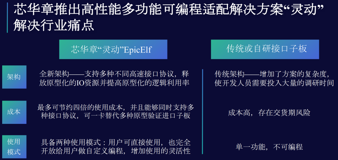 高性能多功能可編程適配解決方案“靈動”(EpicElf)用于FPGA原型化平臺,可一卡替代多種原型驗證進口子板,具備強大的功能和適配能力,可進一步加快驗證收斂,助力軟硬件協同開發,提高芯片設計的研發效率。