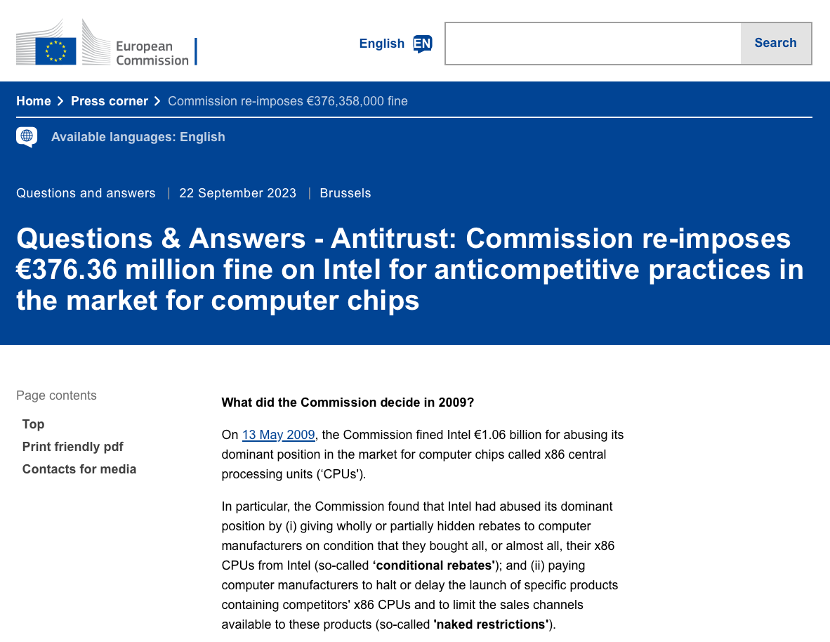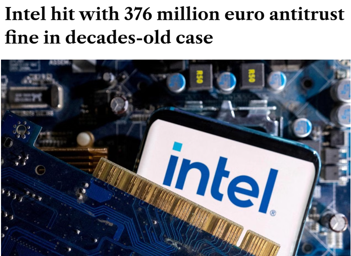 2009年,歐盟委員會(huì)曾因此事對(duì)英特爾處以10.6億歐元(約合82.34億元人民幣)的罰款。2022年1月,位于盧森堡的歐盟普通法院部分廢除了2009年歐盟委員會(huì)的決定,并取消了對(duì)英特爾的罰款。