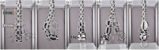 受到象鼻的靈巧操作能力和蛇的吞咽能力的啟發,本文將四個基于CPAMs的TriUnits (以實現足夠大的彎曲角度范圍和負載承載能力) 和三個基于WPAMs的TriUnits (以實現良好的吞咽和抓取) 堆疊為一個多功能柔性臂。其具有較高的操作靈活性,并具有28個自由度 (軸向PAM組為21自由度,截面PAM組為7自由度)。因此,該柔性臂不僅可以實現簡單的多自由度操作運動 (圖8a和圖8b),還可以實現抓取、搬運、吞咽、儲存等多模式操作,如圖8c-e所示。如圖8c所示,NRS柔性臂可以抓取放置在圓柱體 (82 g,外徑130mm,高度90mm) 中的1公斤有效載荷。該柔性臂還展示了透明塑料球 (70g,直徑120mm) 的取放 (圖3 26d)。此外,其還可以像蛇一樣同時吞咽、運輸和儲存物質。例如,吞下一個橢球 (125g,130mm×180mm),并運輸儲存到體內后,繼續抓去另一個球體 (89g,直徑120mm) 并吞下 (圖8)。