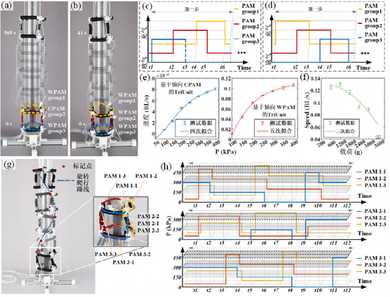 此外,通過改變控制策略,可以實現更多的運動方式。如圖5g所示,具有軸向WPAMs的TriUnit在攀爬管柱時,還能以1.6°/s的速度實現順時針和逆時針旋轉。它的旋轉運動依賴于所有9個驅動器的獨立控制和它們的不對稱運動,這是受到猴子在橫向樹狀運動時肢體和脊柱的協作運動啟發 (圖5h)。