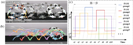 在這項工作中,基于TriUnits的吞咽機器人能夠用于包覆抓取和內穿運輸。本研究中的機器人吞咽機器人不僅可以實現吞咽和儲存,還可以實現類動物的反芻和內部物質運輸。為了更好的可視化,我們將三個TriUnit堆疊在一起,形成一個垂直的機器人吞咽器,其中兩個TriUnit,一個基于WPAMs和CPAMs,另一個TriUnit則完全基于WPAMs。如圖6a為一個直徑120毫米、重89克的3D打印球被機器人吞下。吞咽運動受蛇吞咽的啟發,是通過截面和軸向PAM的不斷擠壓和推動來實現的,由1-6組氣動肌肉的連續膨脹和收縮來實現的,如圖6所示。