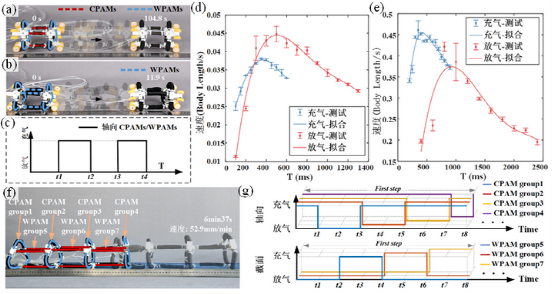爬行是移動機器人的基本運動功能之一。受蠕蟲的啟發,TriUnit也可以用于簡單的單向爬行。由于WPAMs可以實現更大的膨脹行程,具有三根軸向WPAMs的TriUnit爬行器 (配備單向車輪) 比具有三根軸向CPAMs的TriUnit爬行得更快。CPAM和WPAM履帶式機器人的控制策略靈感來自于毛毛蟲的身體爬行和腳定位,如圖所示,其中單節TriUnit僅使用軸向驅動器進行爬行。而以蚯蚓為靈感的波動爬行運動也可以通過堆疊多個TriUnits來實現,不需要單向輪等單向結構,如圖4。