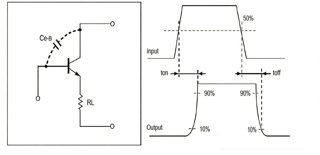 由圖表可看出:由于 CB 間接電容的存在,造成輸入與輸出信號間有個延遲時間,部分光藕在使用中將 B 極與地間加個電阻來減少延遲時間;