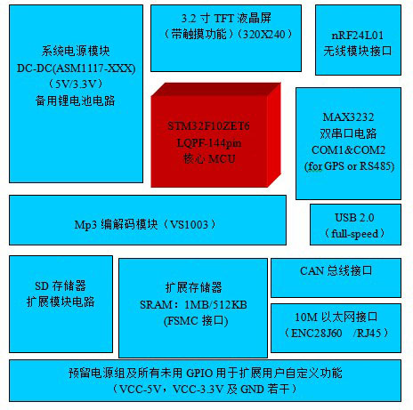 a)2路UART-RS232通信接口(公頭母頭接口各一個); b)1路CAN通信接口; c)1個USB2.0 全速接口; d)SD卡擴展存儲器; e)FSMC接口擴展系統存儲器: * SRAM:1MB 或 512KB,二者關鍵兼容,只是前者多一根A18的地址線; f)MP3編解碼; g)10M以太網接口擴展(RJ45接口); h)nRF24L01無線通信(2.4G); i)3.2寸帶觸摸功能液晶顯示屏; j)4路ADC輸入擴展接口; k)所有用戶可用IO及電源組(5V,3.3V,GND,AGND)引出(2.54標準間距排針);