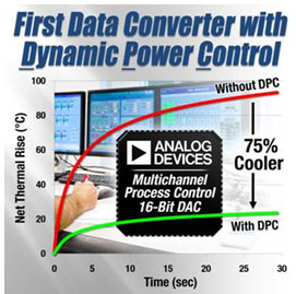 AD5755是一款帶動(dòng)態(tài)功率控制、功能完善的多通道控制IC(集成電路),內(nèi)置4個(gè)帶可編程電壓或4至20 mA輸出驅(qū)動(dòng)器的16位精密DAC。動(dòng)態(tài)功率控制功能的工作原理是連續(xù)檢測(cè)負(fù)載阻抗,為負(fù)載提供所需功率,同時(shí)將系統(tǒng)其他部分的功率損耗降至最低,這樣可以降低自熱和升溫效應(yīng)。這種無(wú)與倫比的功能和性能組合所支持的通道數(shù)是其他集成轉(zhuǎn)換器的4倍,可以在單模擬I/O模塊中以兩倍的性能支持4倍之多的引腳。與其它控制器技術(shù)相比,這款新型的轉(zhuǎn)換器降低了80%的功耗,凈散熱(硅片溫度減去環(huán)境溫度)增強(qiáng)75%。