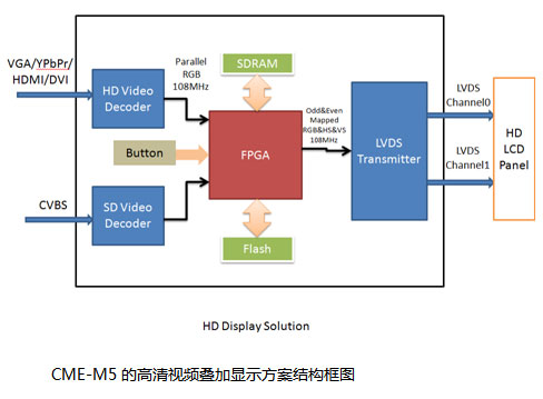 本方案由CME M5(FPGA),video 解碼器,LVDS 發送器等組成,具體功能如下:
