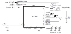 安森美半導(dǎo)體的NCV7430是一款單芯片RGB驅(qū)動(dòng)器,旨在用于專用多色彩LED應(yīng)用,完全符合汽車應(yīng)用要求。這款RGB LED驅(qū)動(dòng)器包含LIN接口(從設(shè)備),用于對(duì)LED色彩及光強(qiáng)度進(jìn)行參數(shù)編程。NCV7430通過LIN總線接收指令,相應(yīng)地獨(dú)立驅(qū)動(dòng)LED。這器件在LIN總線上充當(dāng)從設(shè)備,主設(shè)備可要求獲取特定狀態(tài)信息(參數(shù)值及誤差標(biāo)記)。NCV7430的LIN地址可以內(nèi)部編程在器件的內(nèi)部存儲(chǔ)器中。NCV7430的關(guān)鍵特性包括: