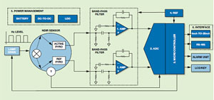 ADI公司NDIR解決方案包括NDIR傳感器、帶通濾波器、微控制器(集成ADC)、電源管理和通信接口。在該系統設計最重要的兩個考慮因素:可靠性和分辨率方面,ADI致力于提供精確、低漂移的信號鏈產品,如零漂移放大器、低噪聲和低漂移基準電壓源、高精度ADC等,以幫助設計師構建精確、穩定的系統。根據具體應用,ADC可以是獨立的或MCU集成的。同時NDIR傳感器的輸出電壓為毫伏(mV)級,為了實現0.1%分辨率,信號調理電路輸入級的噪聲為1 μV左右。信號鏈的常用帶寬小于10 Hz,因此噪聲以放大器的1/f噪聲(0.1 Hz至10 Hz)為主。ADI公司超低1/f噪聲的零漂移放大器可幫助設計師實現高分辨率。