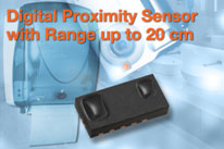 VCNL3020把紅外發射器、光電二極管、信號處理IC和16位ADC集成進小尺寸4.85mm x 2.35mm x 0.83mm表面貼裝封裝的全集成接近傳感器。其他產品只能探測100mm以內的物體,VCNL3020使用10mA~200mA(以10mA遞增)的可編程LED驅動電流,使探測距離延長到200mm,如使用集成的發射器驅動來驅動外部發射器,探測距離可超過1米。VCNL3020對發射信號進行調制,具有優異的抵御環境光能力。