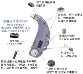 安森美半導體提供用于微型BTE助聽器的完整數字信號處理混合系統方案Rhythm R3710。這器件采用符合RoHS指令的業界最小系統級封裝(SiP),尺寸僅為4.57 mm x 3.12 mm x 1.52 mm,較傳統混合模塊小25%。 這混合系統封裝內包括處理語音算法的數字信號處理器(DSP)、EEPROM、模擬前端、射頻芯片及無源元件,還可根據要求集成其它IC。其中,集成的24位DSP提供高于50 MIPS的運算能力,1.2 V工作時電流消耗低于700 μA。這SiP適合包括微型BTE助聽器在內的所有類型助聽器,能夠幫助克服助聽器組裝方面的主要電聲挑戰。