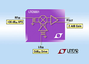 此外,無源混頻器需要高 LO (本機振蕩器) 驅動以達到聲稱的 IIP3。LTC5551 集成了僅需 0dBm 驅動電平的 LO 緩沖器,因此最大限度地減小了外部電路并降低了成本。由于在用戶接收器中消除了大功率 LO 信號,所以 LTC5551 極大地減少了潛在和不想要的輻射,從而簡化了濾波和 RF 屏蔽要求。