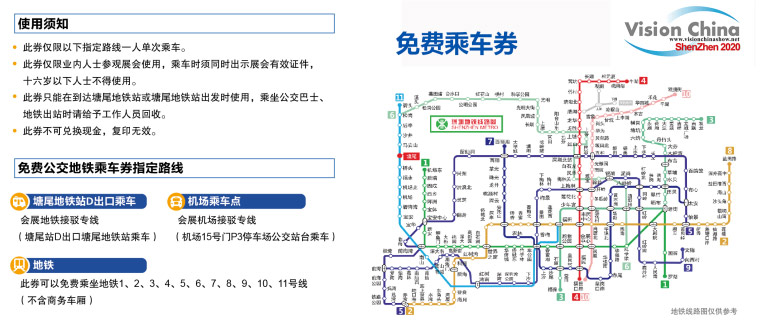 免費(fèi)地鐵乘車券領(lǐng)取,請(qǐng)至深圳國(guó)際會(huì)展中心南登錄大廳(登錄大廳1)領(lǐng)取(此券只能在到達(dá)地鐵11號(hào)線塘尾站或在此站出發(fā)時(shí)使用,乘坐地鐵進(jìn)出站時(shí)請(qǐng)向工作人員出示此券及有效參觀證件)。