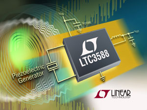 凌力爾特壓電能量采集電源解決方案 LTC3588-1,以優化低壓能源 (包括壓電傳感器)。LTC3588-1 集成一個低損耗、全波橋式整流器和一個高效率降壓型轉換器,以通過壓電傳感器收集環境中的振動能量,然后將這種能量轉換成良好調節的輸出,以為應用微控制器、傳感器、數據轉換器和無線傳輸組件供電。LTC3588-1 在 2.7V 至 20V 的輸入電壓范圍內工作,非常適用于多種壓電傳感器以及其它高輸出阻抗能源。其高效率降壓型 DC/DC 轉換器提供高達 100mA 的連續輸出電流或甚至更高的脈沖負載。其輸出可以設定為 4 個固定電壓之一 (1.8V、2.5V、3.3V 或 3.6V),以為無線發送器或傳感器供電。輸出處于穩定狀態時 (無負載時) 靜態電流僅為 950nA,從而最大限度地提高了總體效率。