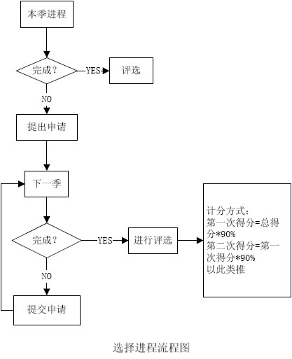 第一季的網(wǎng)友在評(píng)選時(shí)若活動(dòng)不能完成,可以提出申請(qǐng),進(jìn)入第二季的活動(dòng)。但在第二季評(píng)選時(shí),進(jìn)程評(píng)選所得分?jǐn)?shù)* 90%作為評(píng)選的分?jǐn)?shù)進(jìn)行評(píng)獎(jiǎng)。以此類推,每季以90%*上一季所得分?jǐn)?shù)。