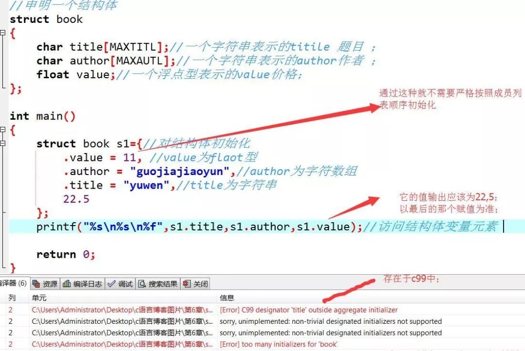 然后就可以像字符數組那樣使用s1.title,像使用float數據類型一樣使用s1.value;